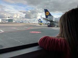 Mit ausreichend Puffer sind wir vormittags in Frankfurt zum Flughafen gefahren und Ingrid konnte sich dort noch einmal richtig austoben durch Rennen und Hüpfen auf den langen Gängen. Vom extra Familien CheckIn über kurze Wartezeiten an der Sicherheits- und Passkontrolle sowie beim Boarding, da man als Familie mit kleinen Kindern immer in die extra Reihe darf, dann noch eine Geschenk für Ingrid und eins für Edgar an Board von den Flugbegleitern, konnten wir wirklich ganz viel Familienfreundlichkeit erleben. Generell waren auf dem Flug mehrere Babys bzw. Kleinkinder dabei und genervte Blicke von den anderen Passagieren sind uns zumindest nicht aufgefallen.